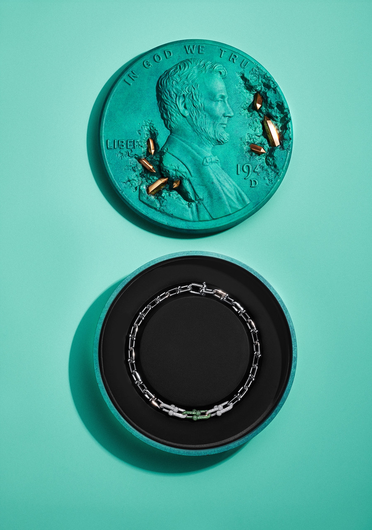 Exkluzivní náhrdelník Tiffany & Arsham Studio HardWear, který najdete uvnitř nádoby, je moderní interpretací ikonického designu Tiffany & Co.® z archivu Tiffany z roku 1971. Stejně jako New York, město, kde se zrodila, ztělesňuje kolekce HardWear trvalou odhodlanost a schopnost udržet si svobodu. Zářivě zelené tsavority, drahokamy, které společnost Tiffany & Co. objevila a představila světu v roce 1974, vzdávají hold jak charakteristické barvě studia Arsham, tak bohaté patině bronzové sochy.