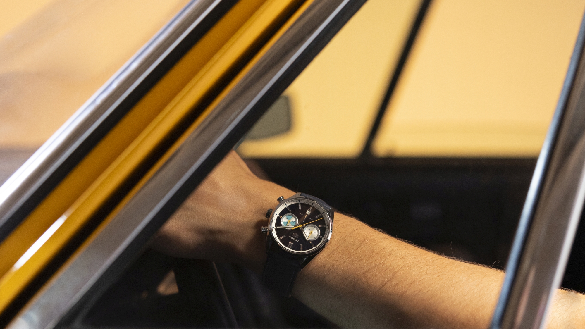 Nový model přináší hluboký odstín půlnoční modři, jenž je oživen tyrkysovými akcenty a sytě žlutými detaily na subčíselnících a ručkách chronografu. Výsledkem je moderní reinterpretace jednoho z historických modelů značky Heuer z 50. let, která propojuje nadčasovou eleganci s odkazem na motoristické závody a životní styl inspirovaný světem cestování.