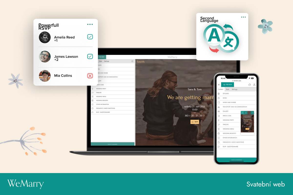● Svatební web, který si v jedné ze tří responzivních šablon může uživatel vytvořit během pár minut přímo na telefonu. K dispozici je několik jazykových mutací, úprava barevného stylu webu či vlastní doména.