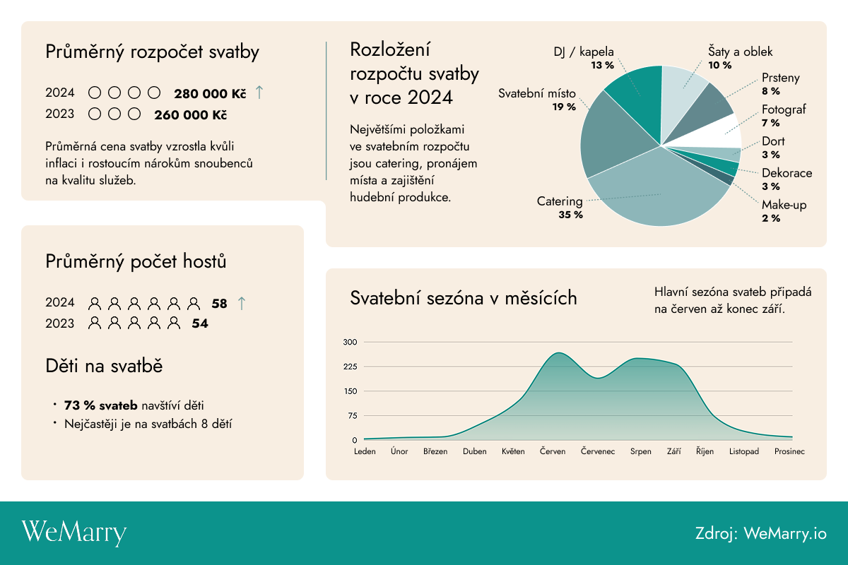 Průměrná česká svatba vyjde v letošním roce novomanžele na 280 000 Kč (přičemž více než třetina z této částky připadne na catering, necelá pětina na pronájem svatebního místa a 13 % na zajištění hudební produkce) a zúčastní se jí 58 hostů. Na 73 % svateb jsou mezi hosty také děti, kterých je na každé svatbě průměrně 8. Údaje vyplývají z dat online nástroje pro plánování svatby WeMarry, který přináší budoucím novomanželům komplexní řešení pro plánování svatby, které výrazně usnadňuje přípravu tohoto významného životního okamžiku a pomáhá párům zvládnout přípravu svatby bez zbytečného stresu.