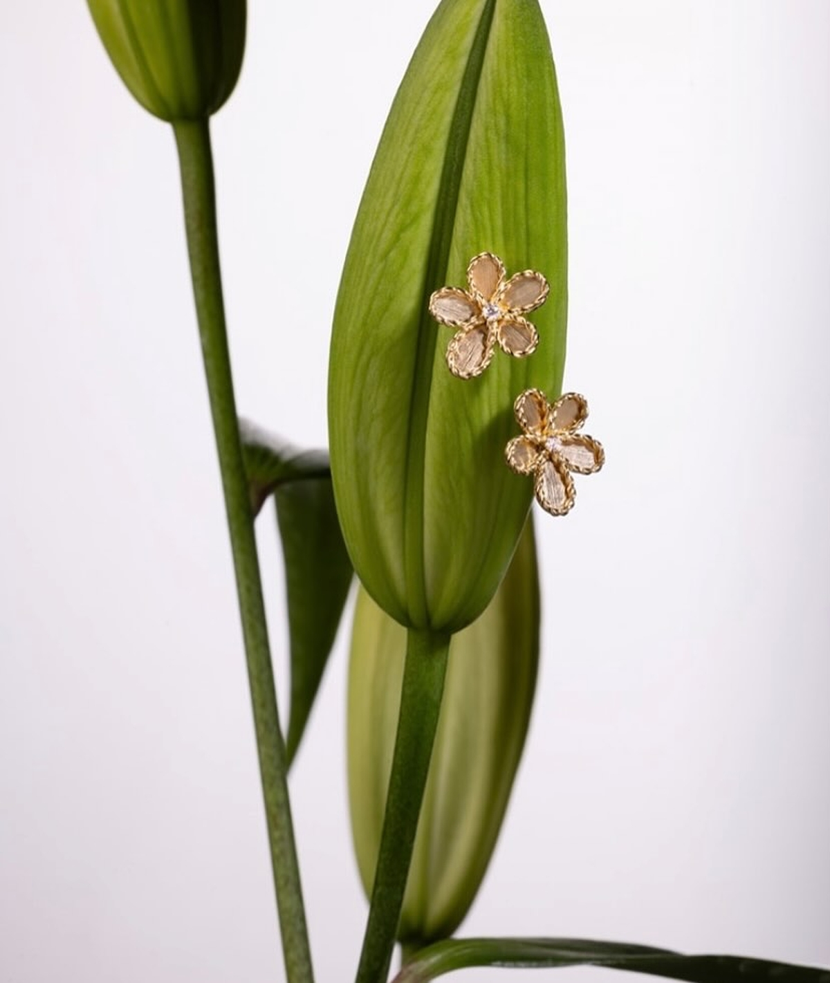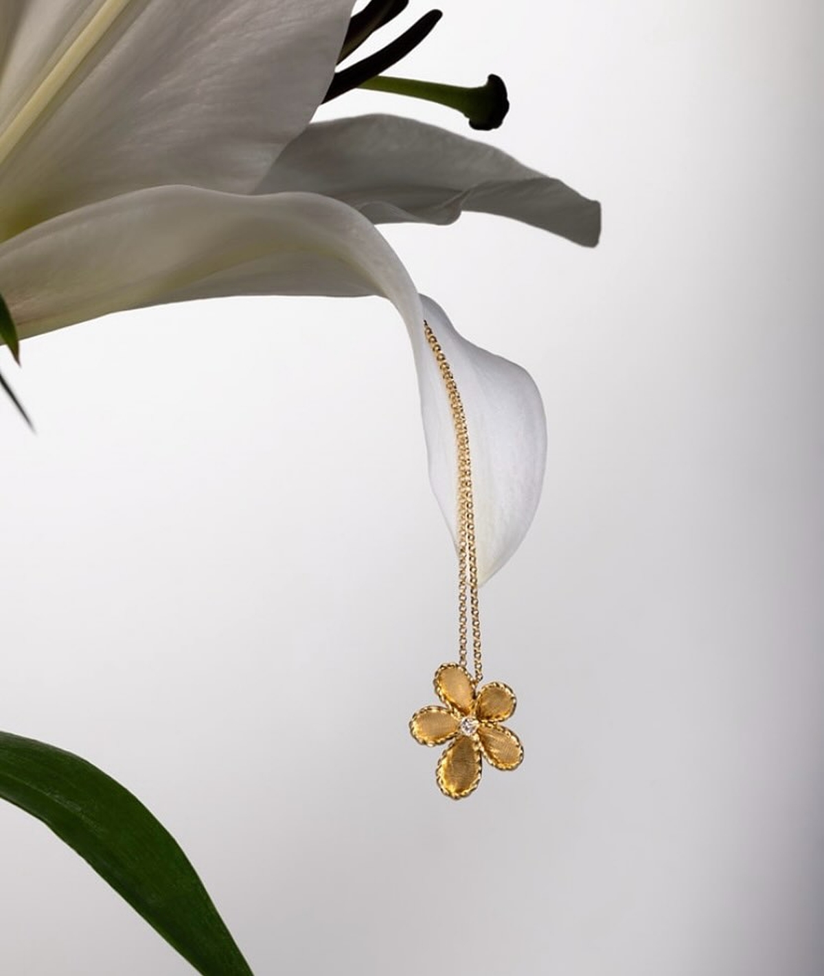 Jasmín, květina s omamnou vůní, která rozkvétá v noci, je v mnoha kulturách symbolem lásky, čistoty a ženské duše. Právě jeho tvar inspiroval design kolekce Jasmine, kde rozkvétá v podobě jemně modelovaných okvětních lístků z precizně zpracovaného 18karátového žlutého a bílého zlata, zdobených třpytem drobných diamantů a jemným leskem perleti.