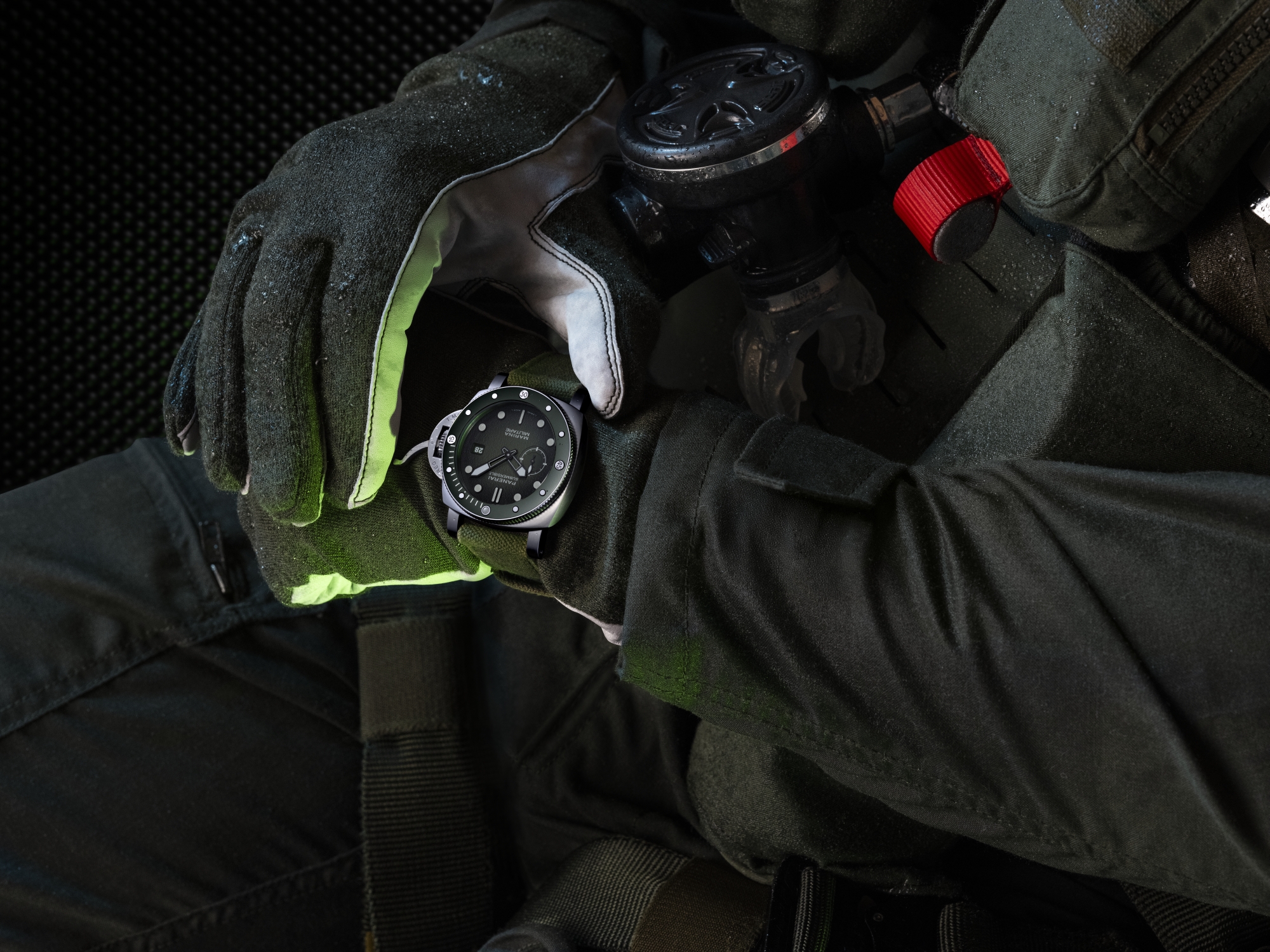 Na dýnku se poprvé v historii Panerai objevuje emblém křídel Aviazione Navale. Oba modely jsou osazeny zeleným plátěným řemínkem s kontrastním prošitím a dodávány s druhým černým pryžovým řemínkem, aby byly připraveny na službu jak pod vodou, tak na souši.