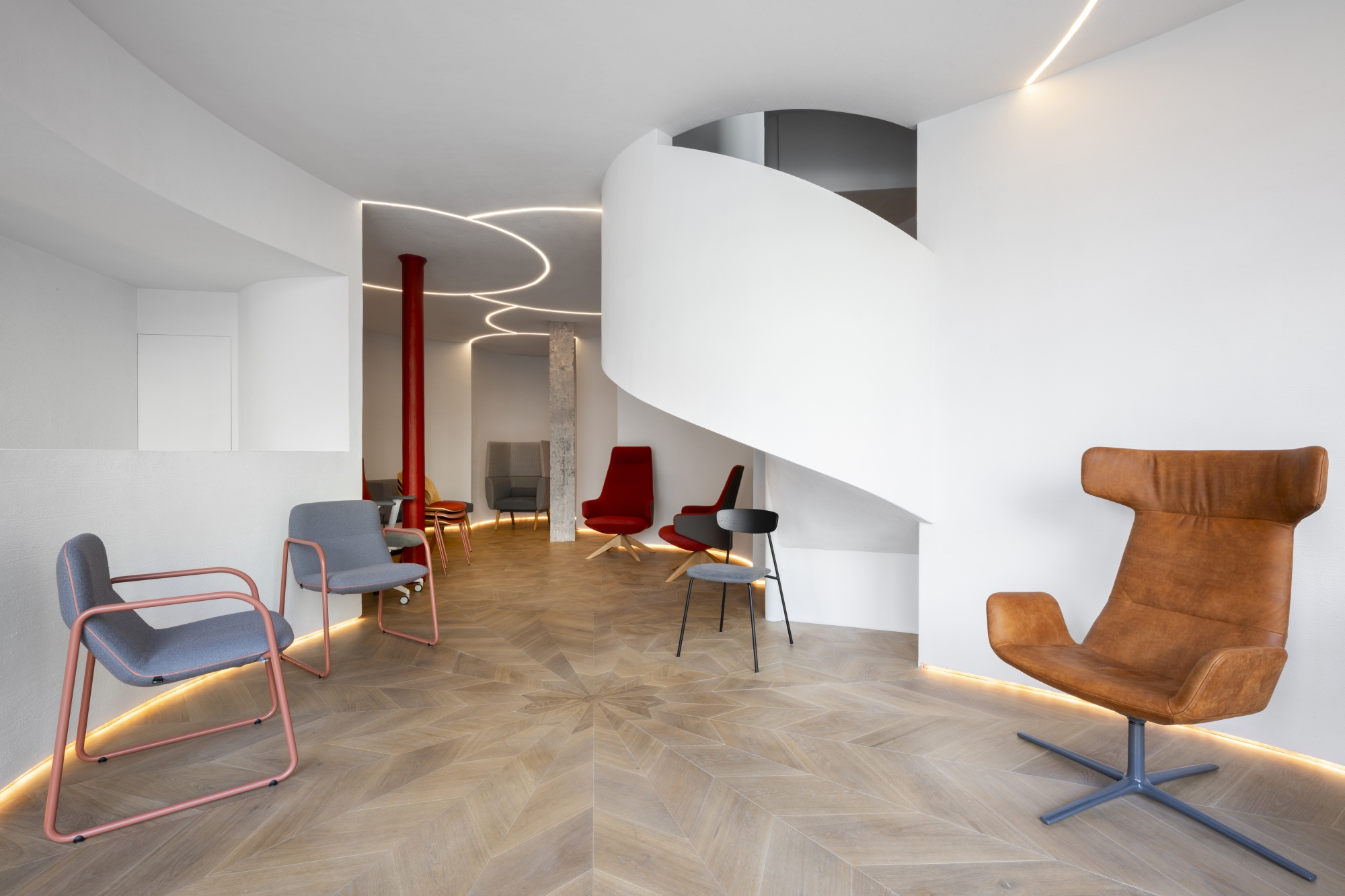 s kuchyňkou je určeno pro jednání. Prostor sdílí více českých značek z oblasti interiérového designu, hlavním partnerem a výhradním dodavatelem sedacího nábytku je však LD Seating.