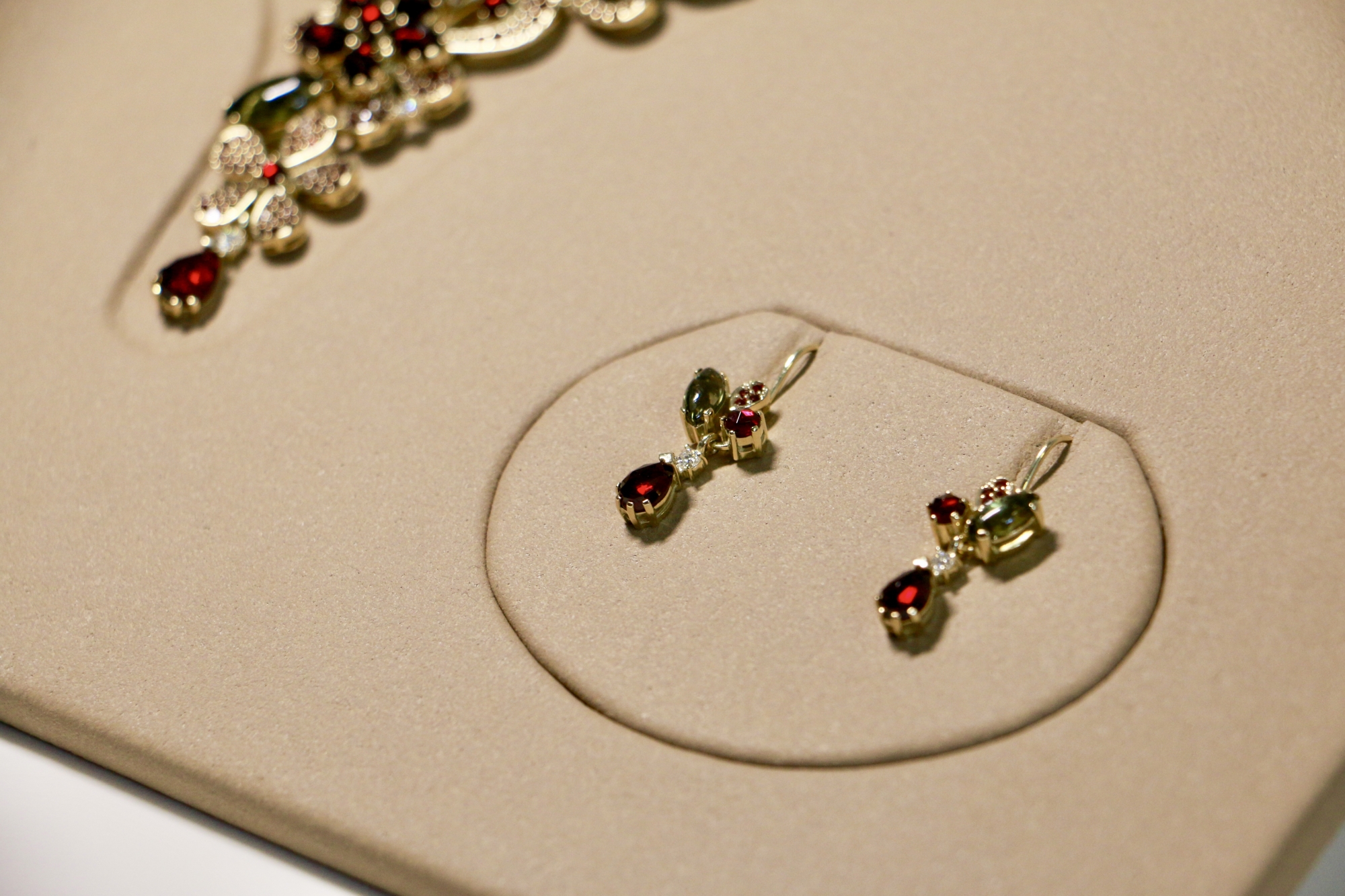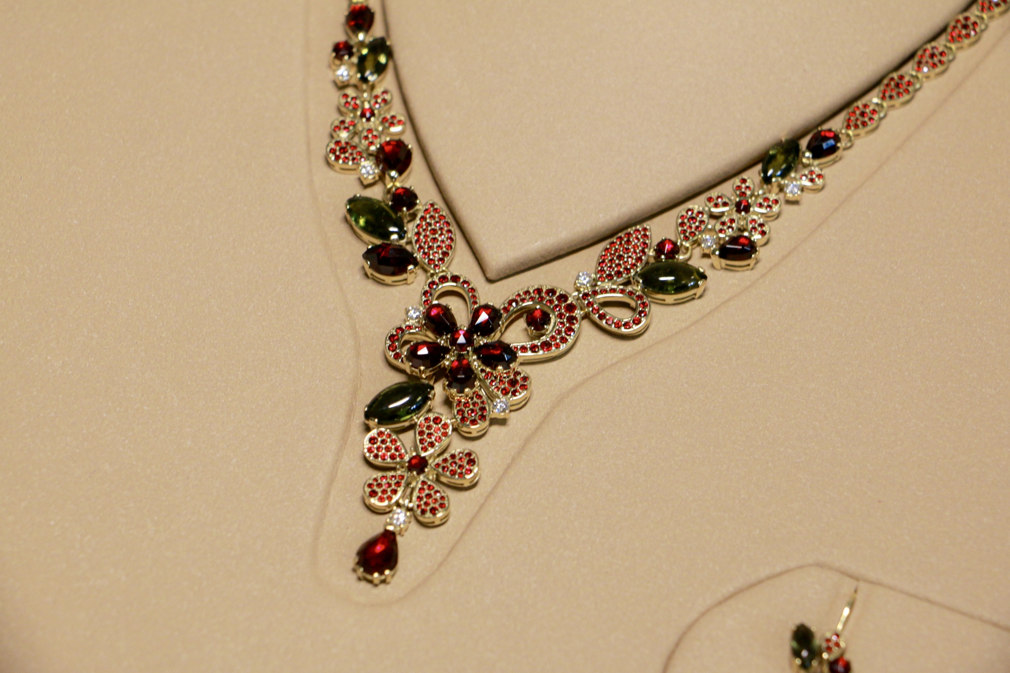 Náhrdelník a náušnice ze žlutého zlata o ryzosti 585/1000 osazené mimořádně velkými českými granáty doplněnými o vzácný vltavín a třpyt diamantů se staly nejen šperkem, ale i symbolem české kulturní identity a tradice.