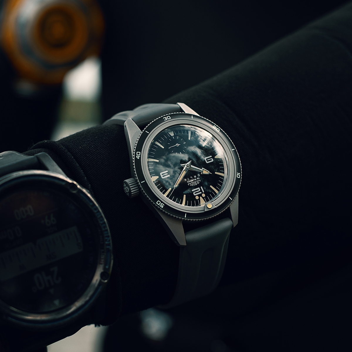 Zůstala i vodotěsnost 6 ATM, přesně podle originálu. Jemné pískování pouzdra a polomatný číselník jsou také detaily, které evokují estetiku původního modelu. Autenticitu podtrhuje šedý kaučukový řemínek s nově navrženou sponou nesoucí manufakturní piktogram a krabička inspirovaná původním balením.