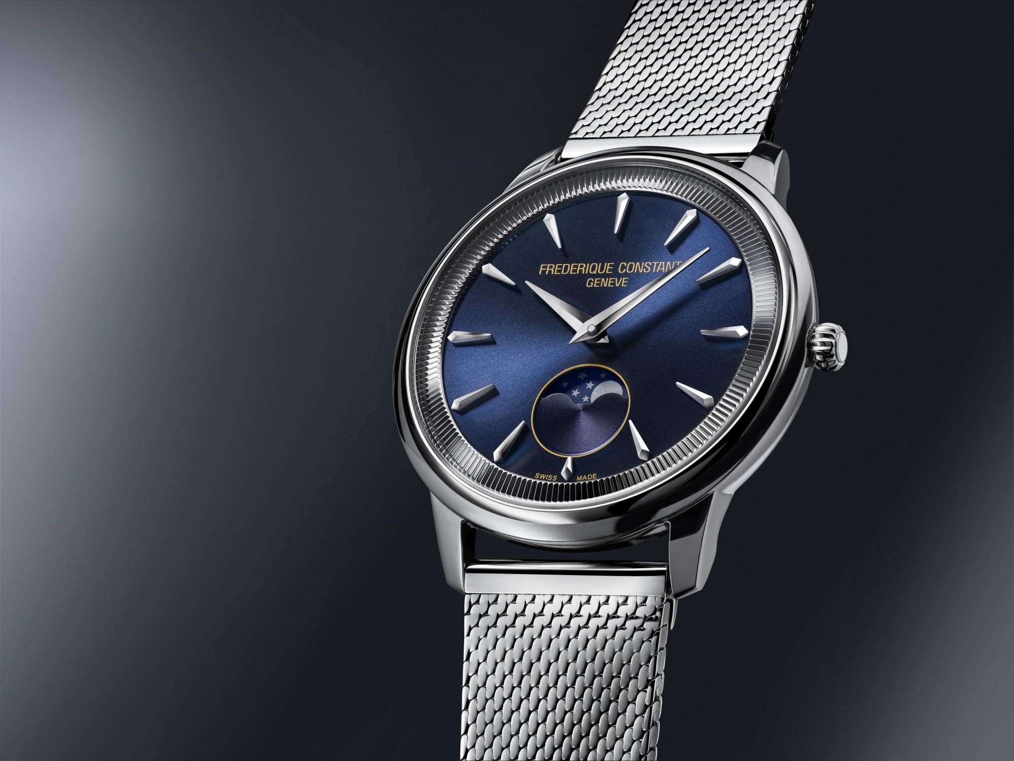 Druhá verze nabízí chladnější eleganci oceli jako dokonalý protipól ke zlatému provedení. Namísto řemínku z telecí kůže je spárována s milánským tahem – dalším prvenstvím v rámci kolekce. Jemně pletený náramek přilne k zápěstí téměř jako druhá kůže a dodává hodinkám odvážně uvolněný a zároveň vintage charakter, který byl tak typický pro 70. léta. Ocelové tóny náramku dokonale vyvažují barvu aplikovaných indexů a dauphinských ruček, stejně jako stříbřitou šeď Měsíce a hvězd. Celou komplikaci obepíná tenká zlatá linka, která koresponduje s nápisem „Frederique Constant, Genève“ na pozici dvanácté hodiny.