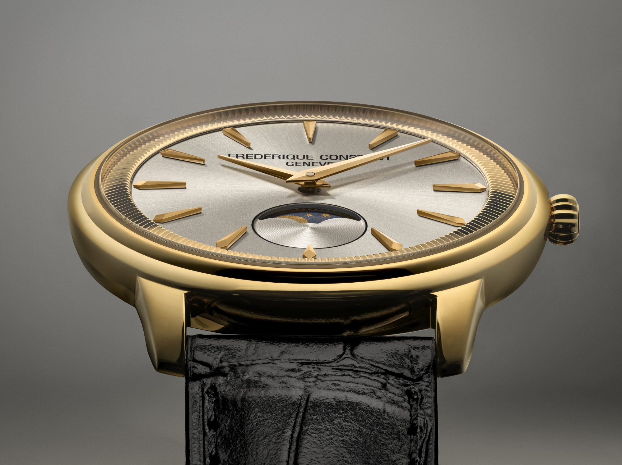 Stylovým podpisem modelů Classics Moneta Moonphase je rehaut inspirovaný vroubkovanou hranou mince. Tento punc ženevského hodinářství byl důmyslně přemístěn z tradičního umístění na lunetě a nově zdobí vnitřní okruží číselníku. Právě v těchto chytrých a sofistikovaných reinterpretacích konvencí se projevuje kreativita a jedinečný designový étos značky Frederique Constant.