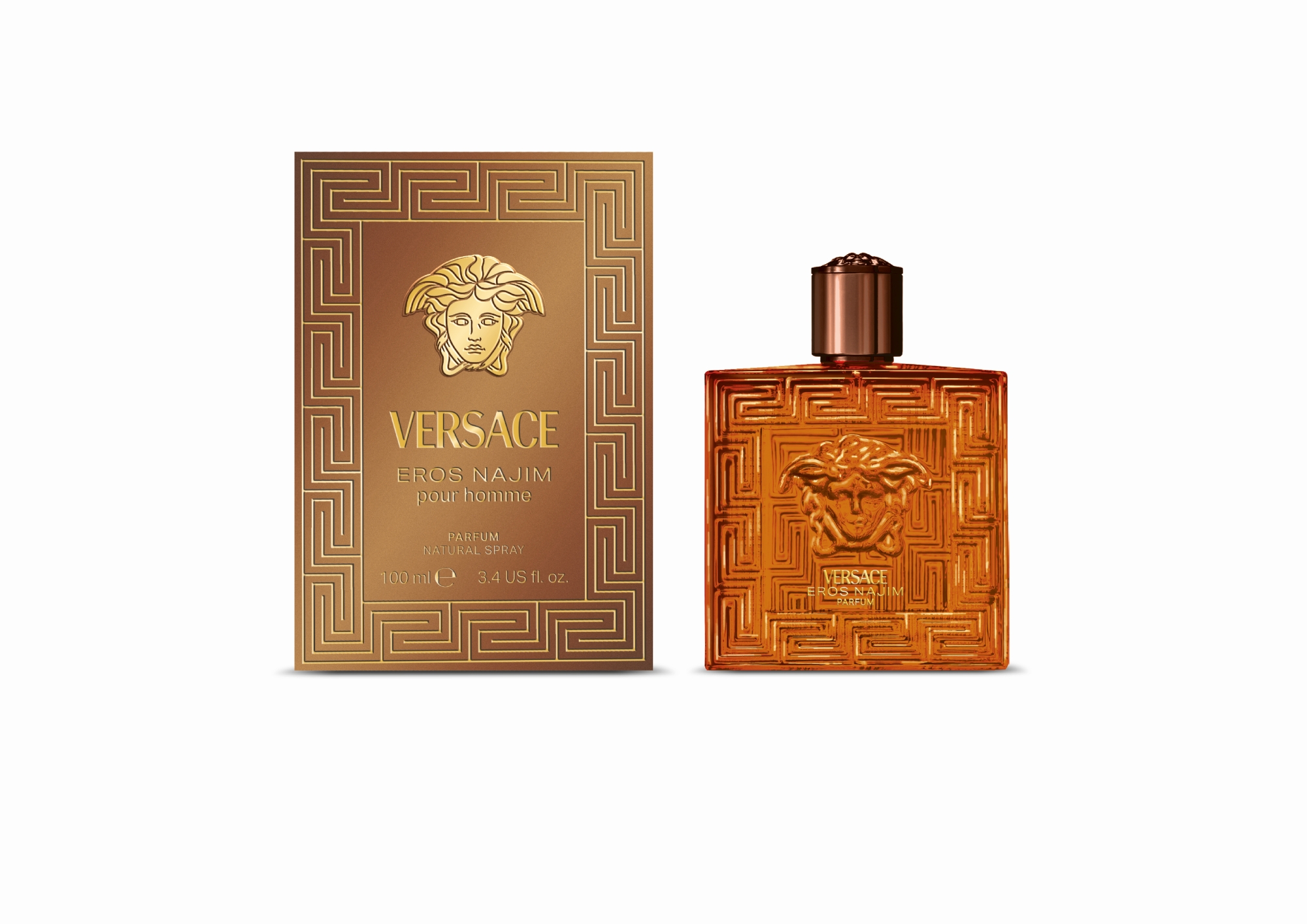 Eros Najim patří do rodiny aromatických a ambrových vůní, které hýří kontrasty – svěžest versus horko, sladkost versus dřevo. Flakon, laděný do odstínů zlatého jantaru, připomíná sluncem zalité duny Blízkého východu. Čisté linie mu dodávají moderní charakter, zatímco ikonická hlava Medúzy a typická klikatá Greca zosobňují moc, přitažlivost a DNA značky Versace. Lesklý bronzový uzávěr pak působí jako šperk korunující parfémový poklad, který v sobě ukrývá hvězdnou esenci Orientu.