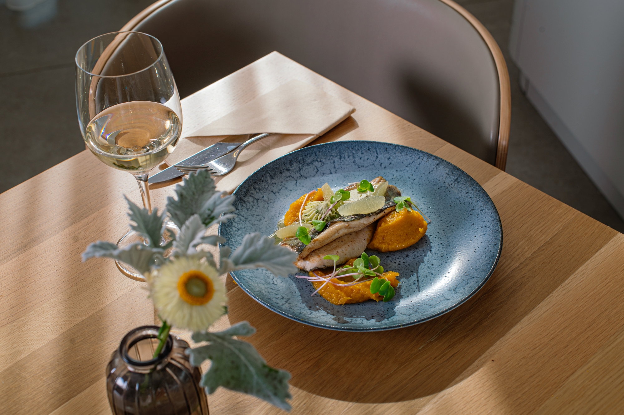 Uvolněné prostory restaurace Hvozd přirozeně zapadají do okolní přírody Českého lesa. Interiér pracuje s přírodními materiály a kuchyně pod novým vedením Radka Kotlána reflektuje totéž – čistotu, jednoduchost a autenticitu.