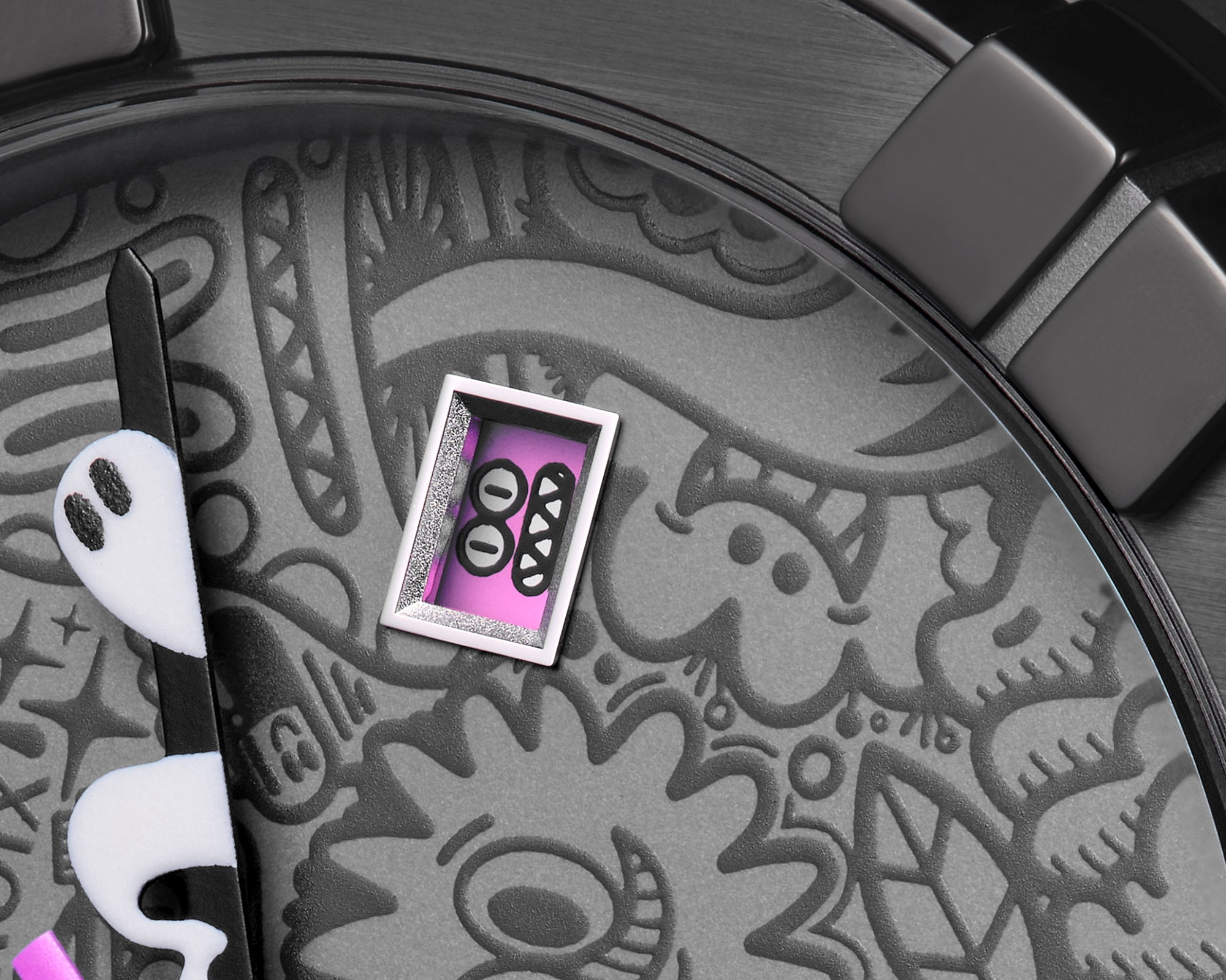 V této monochromatické strohosti se však skrývá exploze fantazie. Ciferník v šedém tónu ožívá díky jemnému tisku Wottových postav – lebek, duchů a podivuhodných bytostí z jeho snového bestiáře. Motivy se objevují až při určitém úhlu světla – jako tajemství, které nechce být odhaleno hned.