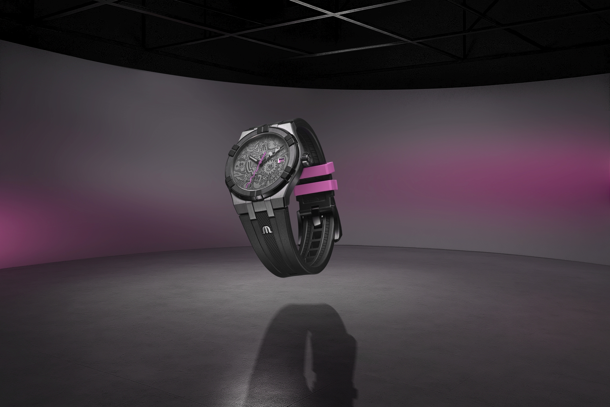 Záblesk humoru přináší minutová ručka s malým zářícím duchem, který se při čtení času nenápadně pohybuje po ciferníku. Ručky z matné černi s bílou luminiscencí zaručují dokonalou čitelnost, zatímco sekundová ručka v sytě růžové barvě vnáší do designu nečekaný puls života. Stejný růžový tón se objevuje i na očkách kaučukového řemínku s Easychange systémem – důkaz, že i technická preciznost může mít duši.