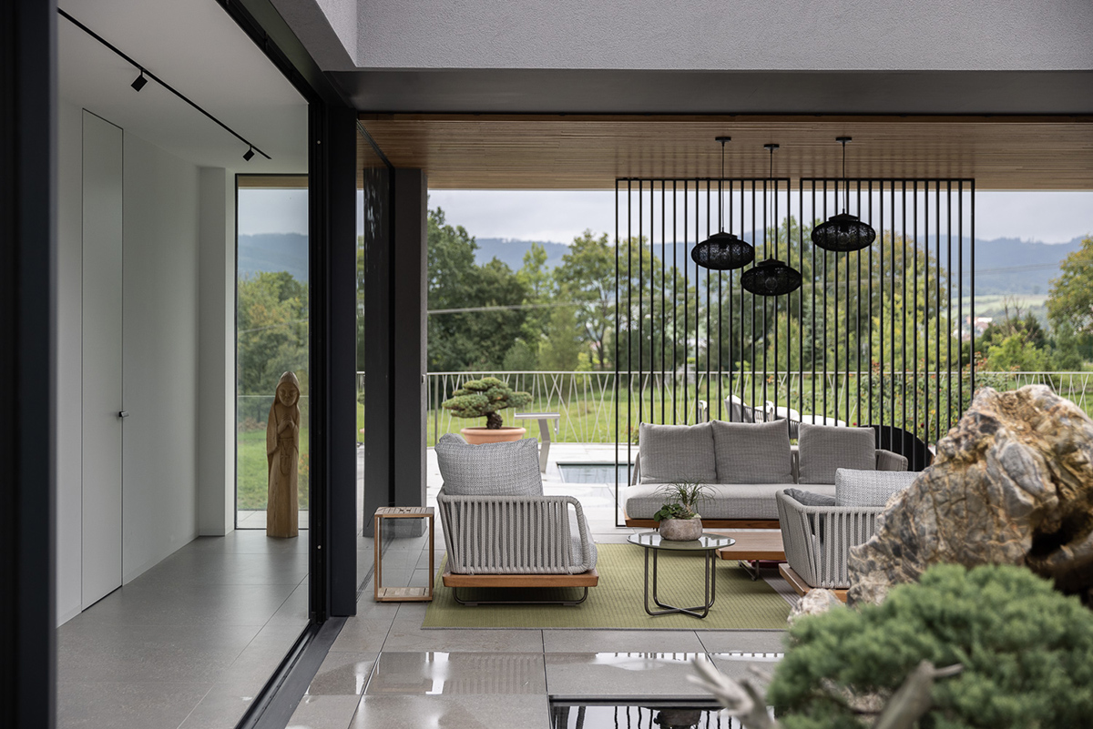 Odsunutím velkých prosklených stěn lze interiér snadno propojit s venkovním prostředím, a navodit tak nejen pocit, ale i realitu bydlení v přírodě. V každém bodě kterékoli obytné místnosti je zprostředkován kontakt se zahradou, která je pojata velkoryse v anglickém stylu. Nechybí ani 25metrový bazén, jejž majitelé využívají k tréninku na triatlon. Před sluncem dům chrání venkovní pohyblivé stínicí markýzy ze dřeva.