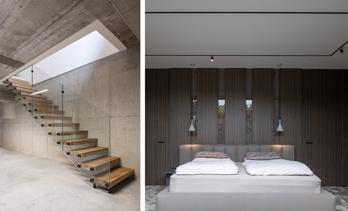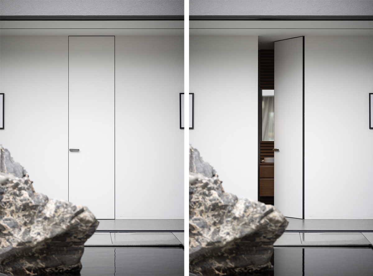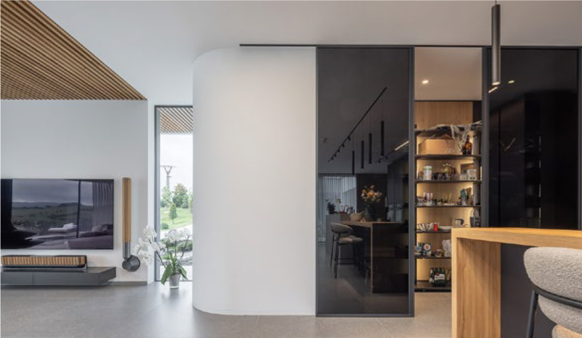 Koncepce interiéru domu je založena na světlé výšce místností 2 800 milimetrů. Tu dodržují i dveře ve skryté zárubni, které stejně jako obklad stěn EFEKTA, stínicí markýzy a schodiště do suterénu vyrobila a namontovala firma JAP. „Otočné dveře MASTER bez nadpraží ve skryté zárubni AKTIVE nemají s touto výškou žádný problém díky unikátní konstrukci, jež je tvořena hliníkovým rámem, takže se architekti nemuseli nijak omezovat. Designovou parádou je jemný kontrast mezi bílým opláštěním dveří a černou linkou hliníkového rámu,“ upřesňuje PaedDr. Petr Paksi, DBA, jednatel firmy JAP, a doplňuje: „Myslím, že se podařilo funkčně začlenit i prosklené posuvné dveře v rámu IDEA, které přirozeně oddělují obytné a servisní místnosti. Navíc perfektně podtrhují minimalistický trend interiéru.“
