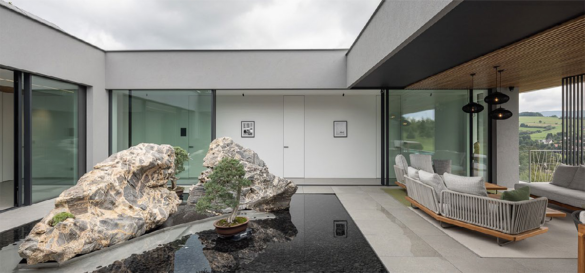 Hlavní atrium s půltunovými kameny a bonsajemi je srdcem domu.