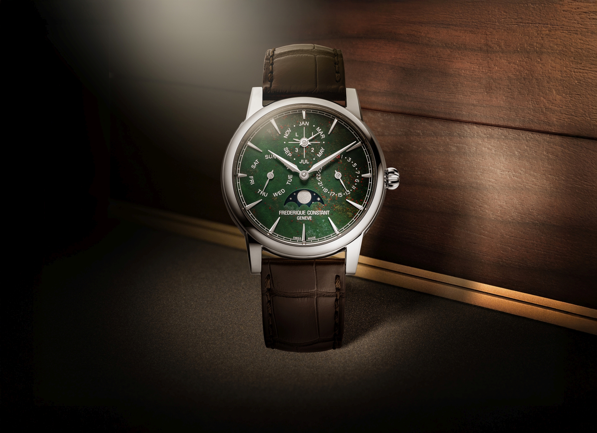 Ocelové 40mm pouzdro ukrývá číselník, jehož uspořádání dne, měsíce a data je vzorem čitelnosti. Diskrétní indikace přestupného roku je nenápadně umístěna v počítadle měsíců. Měsíční fáze na šesté hodině odhaluje pohled do ručně opracovaného výklenku v heliotropu. Safírové dýnko hodinek poskytuje intimní pohled na kalibr FC-776, zdobený perláží a ženevskými pruhy, s 72hodinovou rezervou chodu.