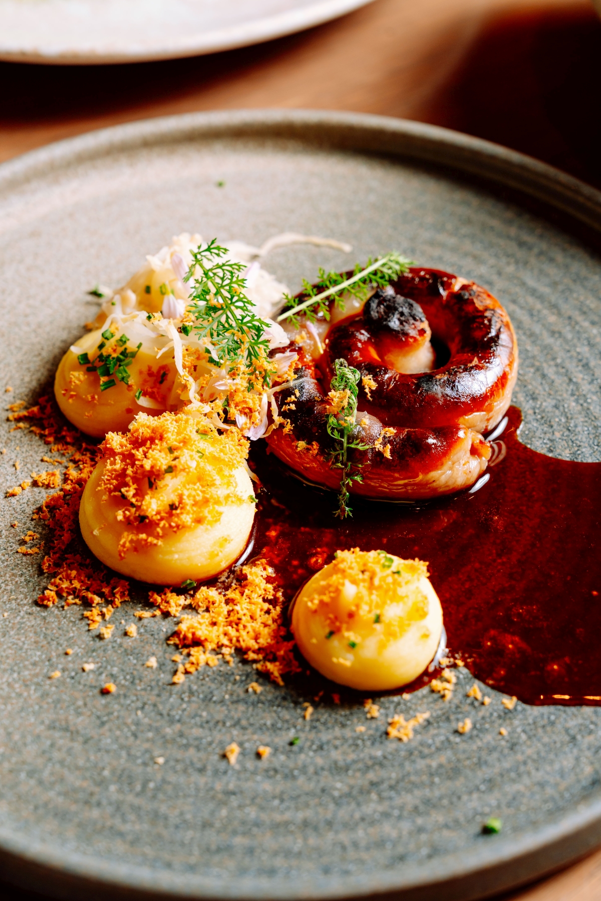 Hlavní chody vzdávají hold ikonickým vánočním chutím. Vinná klobása s okurkovým gelem, kysaným zelím a uzenou bramborovou kaší představuje moderní interpretaci klasického stánku a pomyslný symbol českého svátečního stolování se objevuje jako trhané kachní maso s lokšemi, pyré z červeného zelí a kachními škvarky.