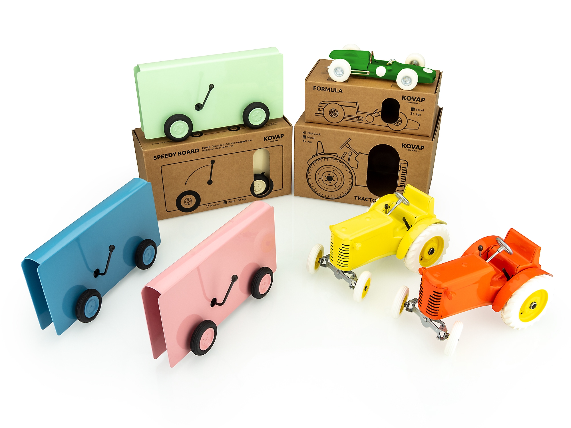 Symbolem značky KOVAP je bezpochyby legendární plechový traktůrek na klíček. Nejde jen o hračku – díky funkční převodovce se zpátečkou a realistickému ovládání představuje malý technický zázrak, který děti nejen baví, ale i učí chápat mechaniku. Pro menší děti je k dispozici i jednodušší varianta bez strojku, kterou lze snadno ovládat volantem. V obou případech jde o nadčasový dárek, který se jen tak neokouká.