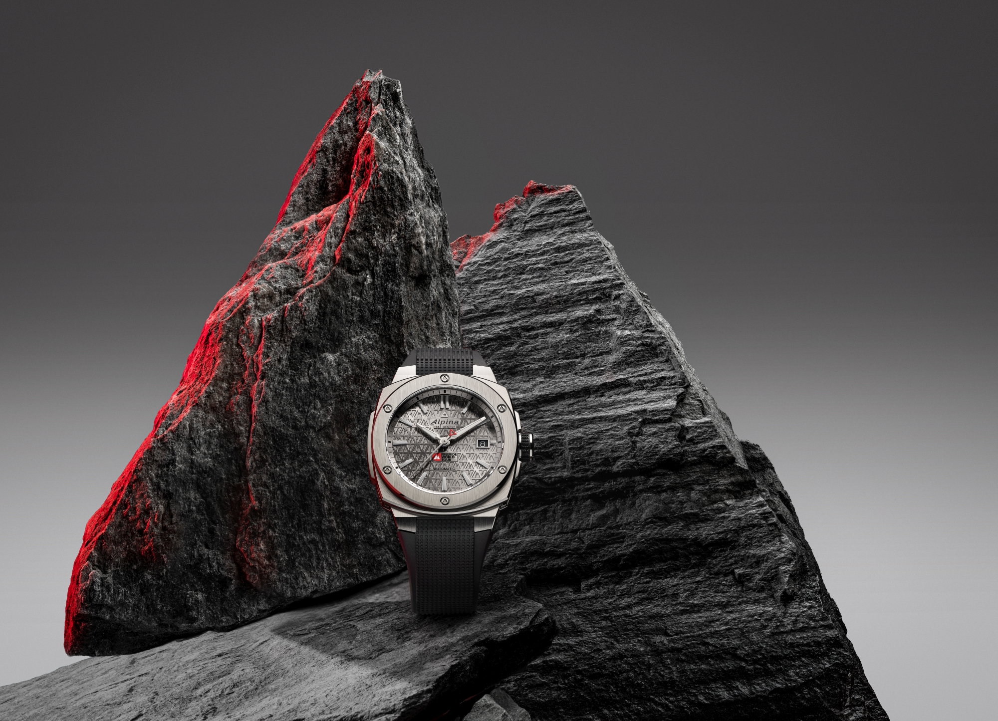 Alpina a Freeride World Tour spojuje stejný puls: hory, adrenalin, odvaha a neústupná touha posouvat limity. K devátému výročí partnerství proto vzniká Alpiner Extreme Automatic FWT, model, který propojuje svět vrcholového freeridu se švýcarskou hodinářskou precizností. Šedé pouzdro evokuje alpskou žulu a poprvé nese reliéfní logo FWT – symbol stopy mířící z vrcholku dolů, přesně jako u freeriderů. Černý gumový řemínek je navržen pro náročné venkovní podmínky, zatímco uvnitř pracuje spolehlivý kalibr AL-525 s 38h rezervou chodu, ideální pro intenzivní sportovní použití.