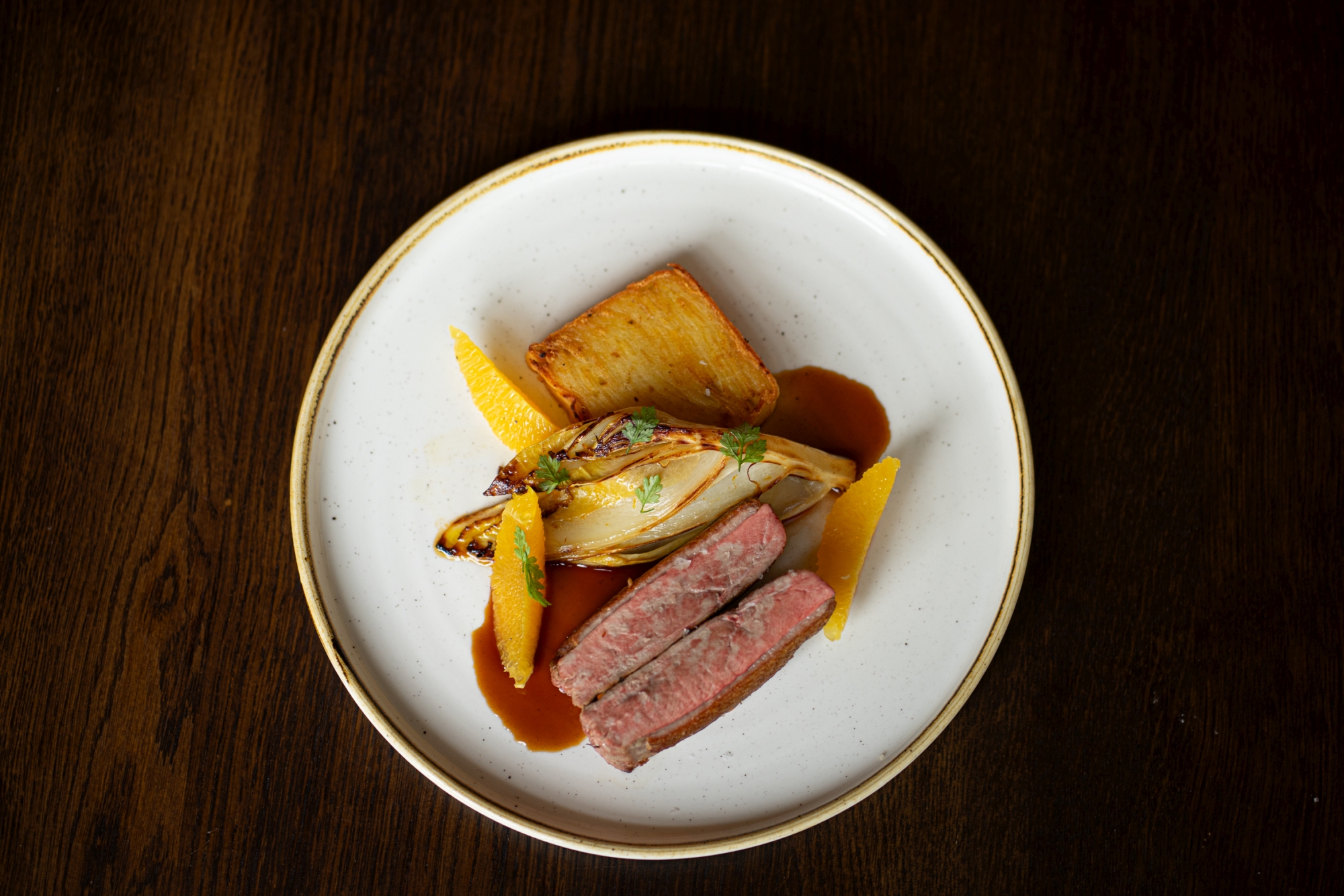 Pečené kachní prso, karamelizovaná čekanka marinovaná v pomerančové kůře, bramborové pavé a Bigarade omáčka