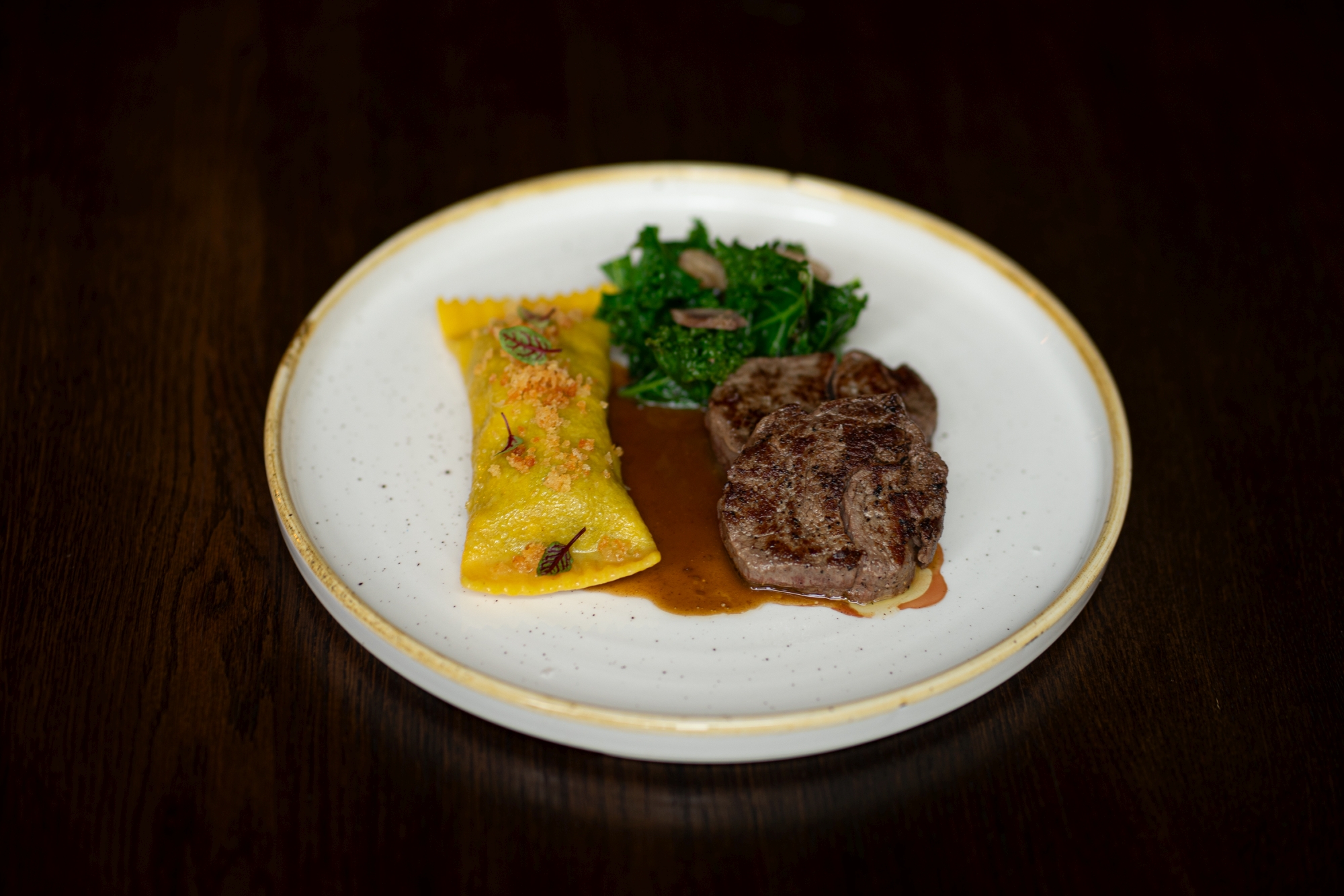 Medailonky z hovězí svíčkové, raviola plněná kořenovou zeleninou a kaštany, kadeřávek a omáčka z koňaku a kachních Foie Gras