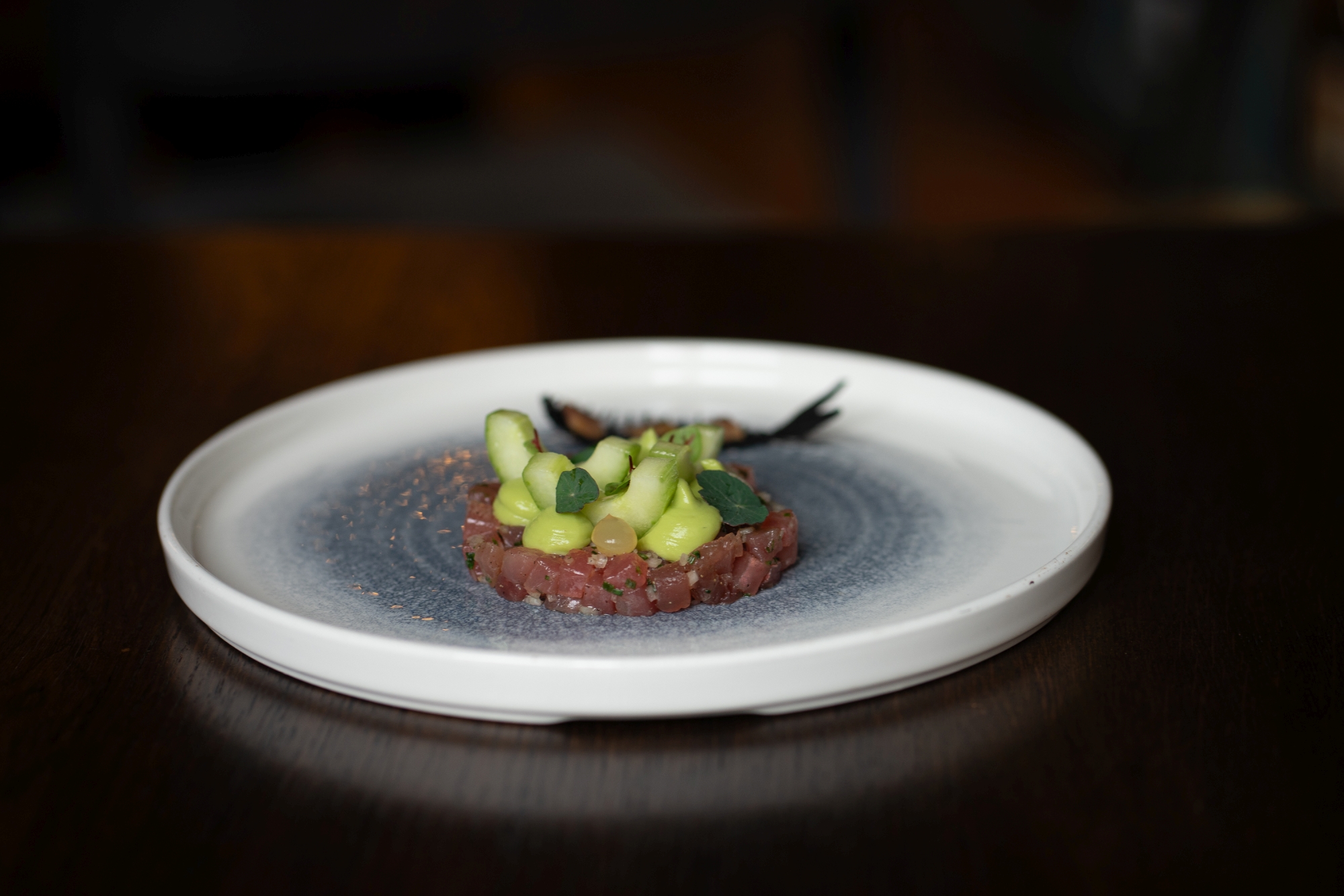 Tartar z tuňáka, avokádový krém, gel z yuzu, salátová okurka a krekr z ančoviček a sepiového barviva
