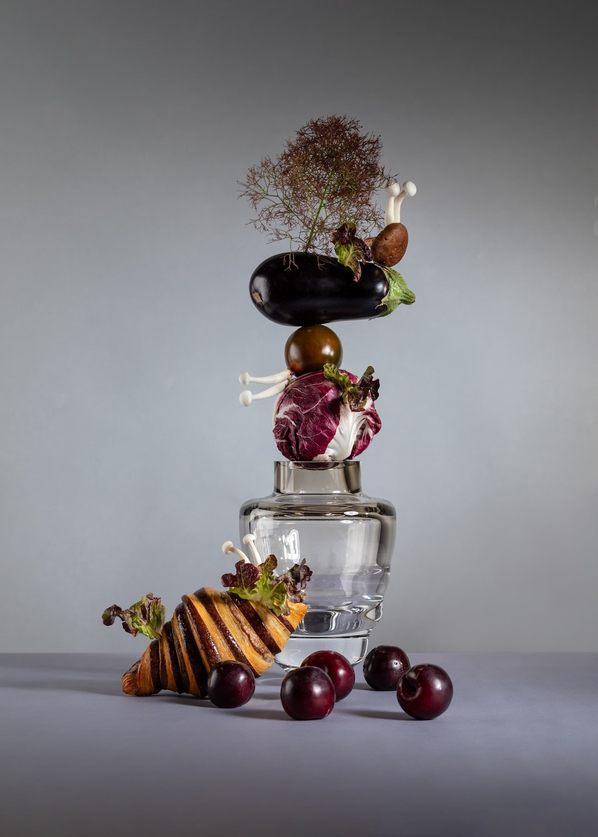 Zatímco pro zátiší starých mistrů je typická harmonická kompozice, ta moderní se nebojí měnit perspektivu a běžně porušují pravidla symetrie i prostorové logiky. Právě takový přístup zvolila i trojice spolupracovníků. Na fotografiích Anny Pleslové se vázy, květiny i pečivo ocitají v nových perspektivách, odlišných od jejich původní funkce. Vázy ze z prostého nositele květin mění v promyšlenou součást každého zátiší, které floristka Markéta Hývnarová oživuje kombinací živých květin, zeleniny a hub. Posledním dílkem obrazu se stává pečivo Lucie Caïs Steblové, které podtrhuje celkový výjev. Vše je aranžováno v hravém stylu italského malíře Giuseppa Arcimbolda. Prolínání materiálů, struktur a barev na fotografiích vytváří koláž, která upoutá všechny smysly pozorovatele.