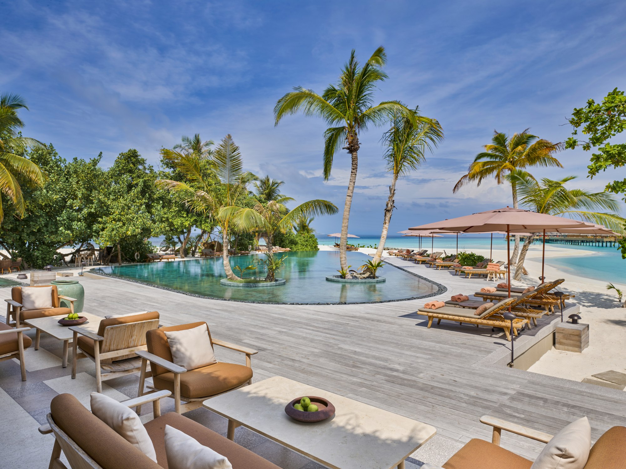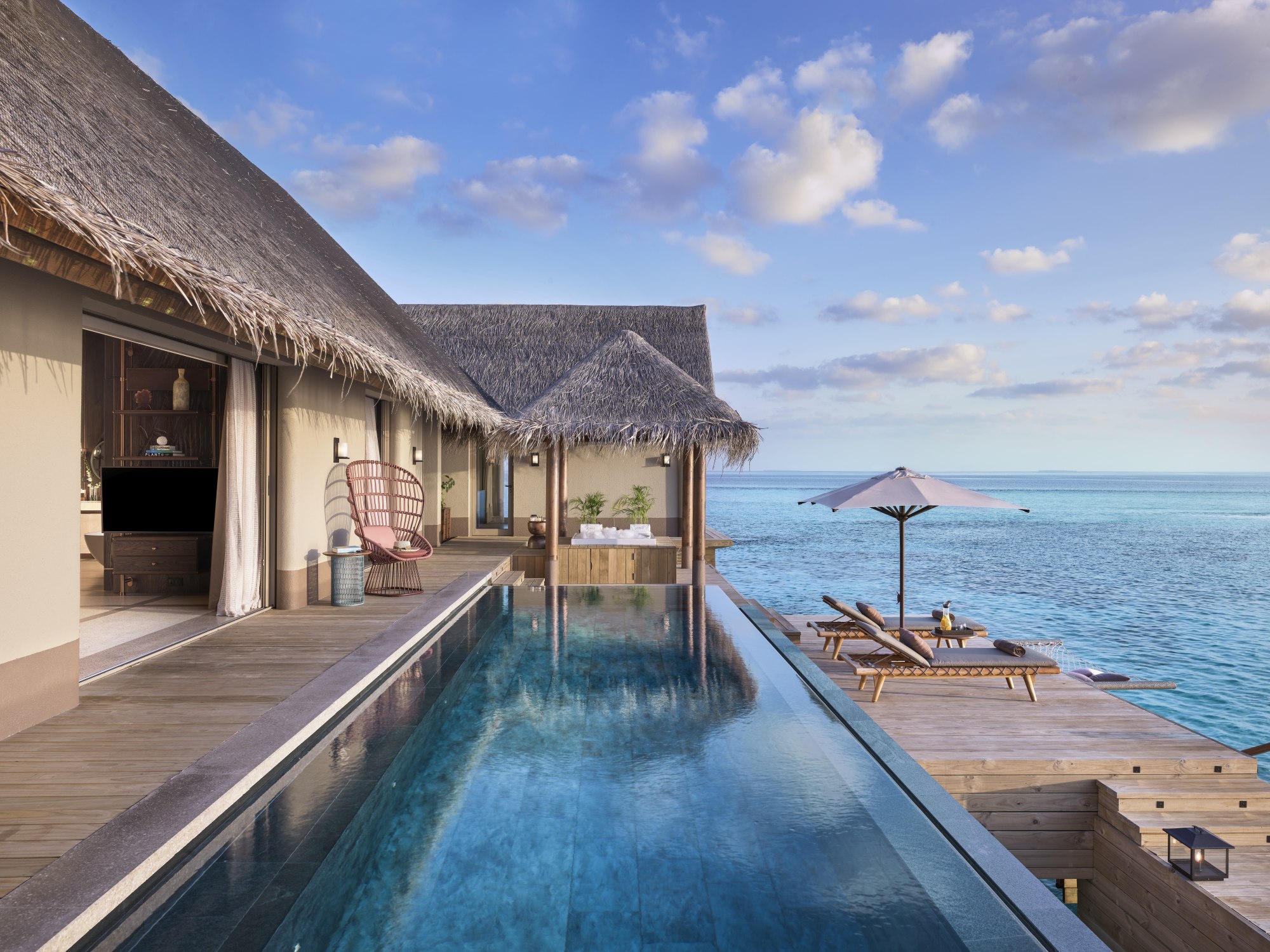 Bývá zvykem si na dovolené přispat. Nechat ráno jemně splynout s polednem a den začít skleničkou Blanc de Blancs na pláži – večery pak opačně protáhnout dlouho do noci. To samozřejmě ani zde není problém, ale upřímně – byla by to chyba. Východu slunce nad oceánem se jen tak nic nevyrovná, a to ať už jej sledujete ze své privátní pláže u vily nebo od vlastního infinity bazénu u water-vily rozprostírající se nad hladinou oceánu, díky čemuž se dny a noci mění v tekutou poezii světla.