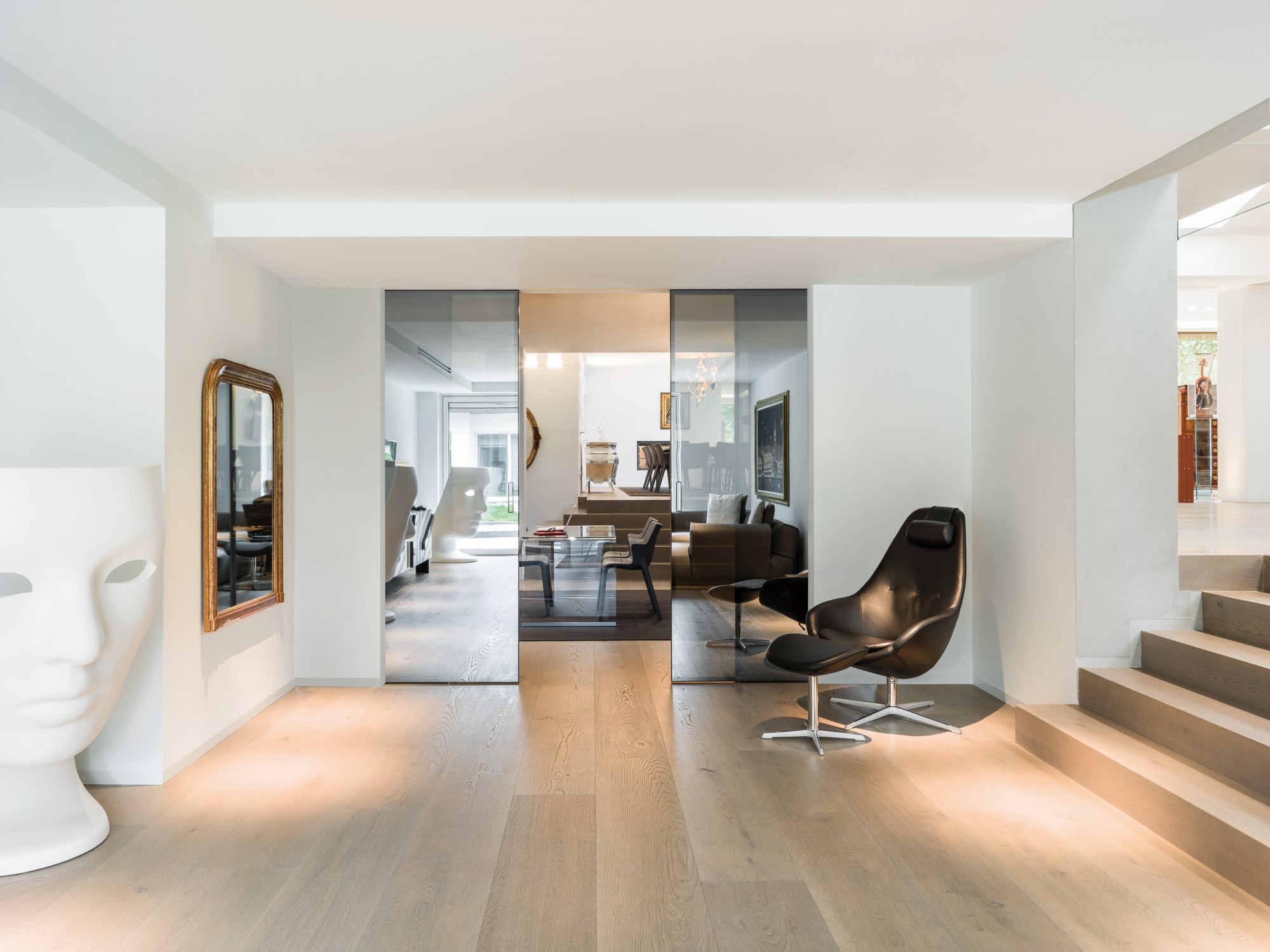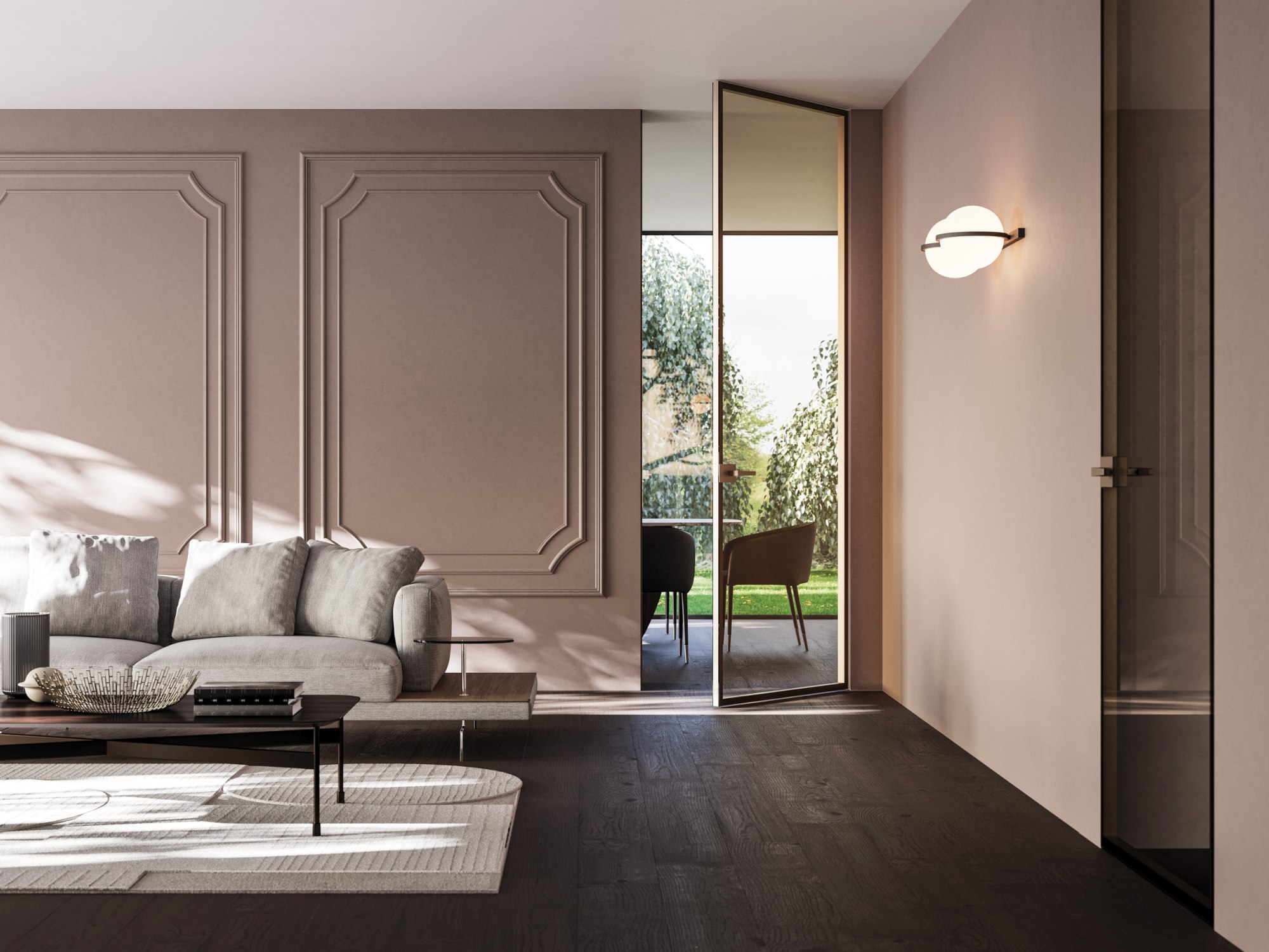 Při volbě otočných skleněných dveří ECLISSE máte na výběr z více variant. Rám může být viditelný jen z jedné strany, nebo se úplně schovat mezi dvě skla, takže působí subtilně. Dveře fungují s klasickými i skrytými zárubněmi a je možné umístit je i do šikmých zárubní na míru v atypických prostorách.