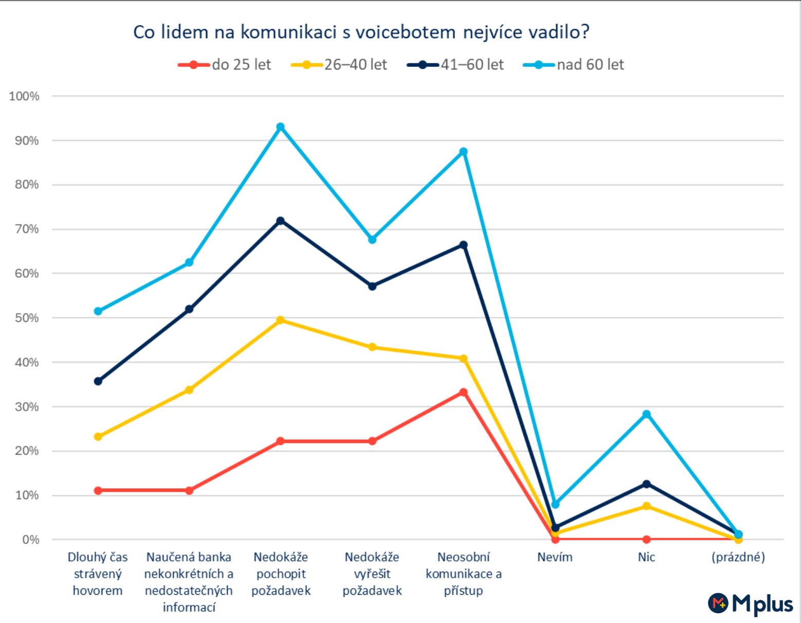 Negativní. Tak popisují Češi nejčastěji svou zkušenost s voiceboty na zákaznických linkách. Hodnocení přitom nezávisí na věku, voiceboty nevyhledávají ani mladí, ani starší lidé, jak ukázal průzkum společnosti Mplus Czechia. Více než polovina Češek a Čechů se zlobí, když jim voiceboti nerozumí (60 %), druhým nejčastějším důvodem rozladění je neosobní komunikace a přístup (53 %). Pokud zákazníci něco oceňují, je to rychlost AI řešení. Vždy ale raději mluví s člověkem.