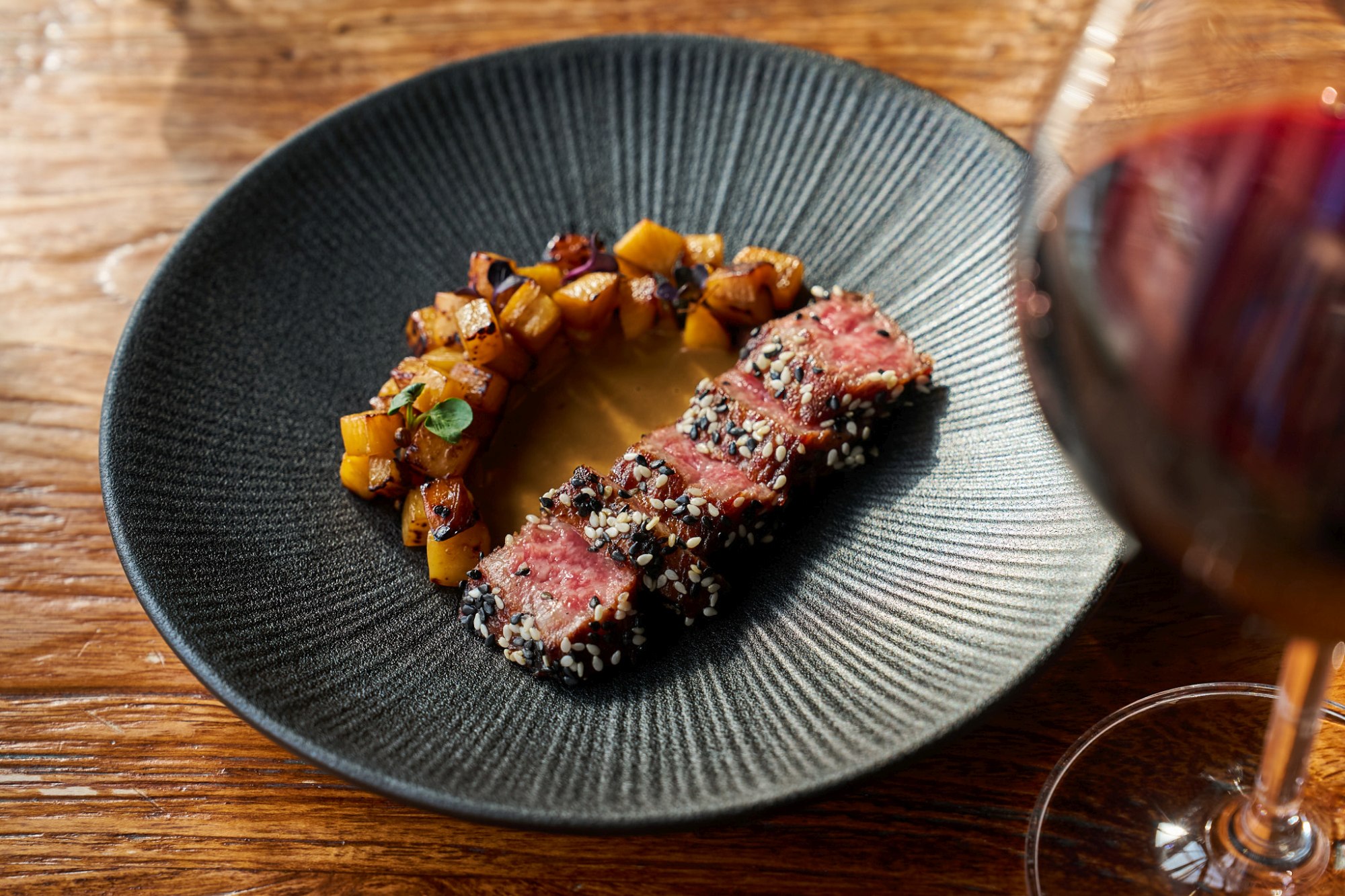 Grilovaný flank steak ze španělského iberského polodivokého prasete vynikne s nadýchanou hříbkovou omáčkou a zapečenými plátky brambor. Nakládané asijské houby shimeji a olej s mořskou řasou kombu přidávají pikantní akcent.