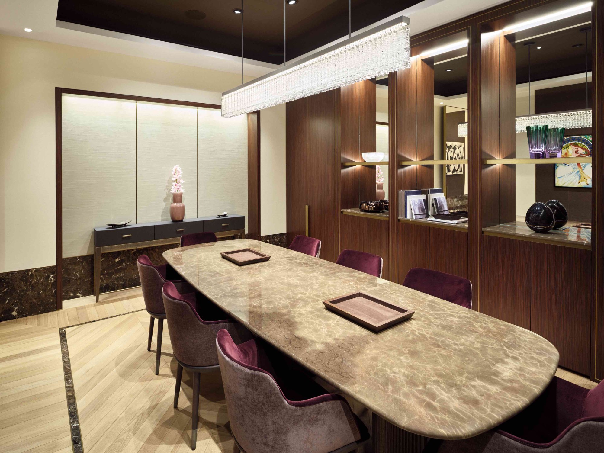 V interiérech byly použity vybrané materiály: exotické palisandrové dřevo, broušená masivní mosaz, exkluzivní španělský mramor v barvách Emperador Dark Brown a Créma Marfil. Sofistikovaný vzhled dotvářejí lustry Baccarat, originální objekty včetně sochařské práce od francouzského umělce Thierryho Martenona i doplňky od italské designové značky Venini.